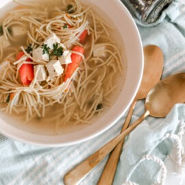 - Strain broth and return to low heat adding back in any preferred veggies. (I like to add the carrots back in)