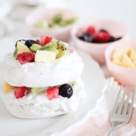 Start with one pavlova nest in the centre of the plate. Place a dollop of coconut whip into the centre of the nest and spoon fresh fruit on top. Add another pavlova and repeat. Serve immediately. Keep any remaining pavlova's in an air tight container for up to 7 days. If they begin to get sticky, simply bake them in the oven again at 200*F until they dry out.
